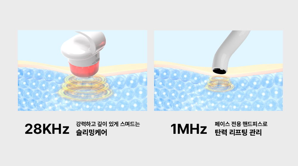 28KHz 전용 바디 핸들을 통해 복부, 허벅지, 팔뚝 등 지방층이 두꺼운 부위를 정밀하게 타겟팅하여 관리할 수 있습니다. 넓은 면적의 핸드피스는 전신 관리에 효율적이며, 관리 중 출력되는 LED 라이팅 효과가 순환을 돕고 피부 결을 매끄럽게 정돈해 주는 시너지 효과를 제공합니다.